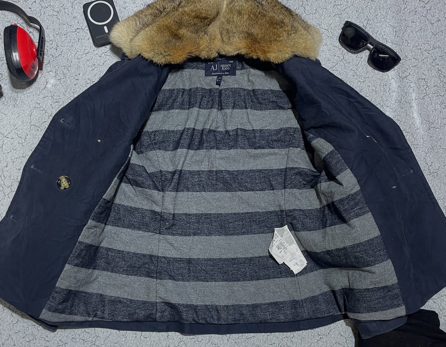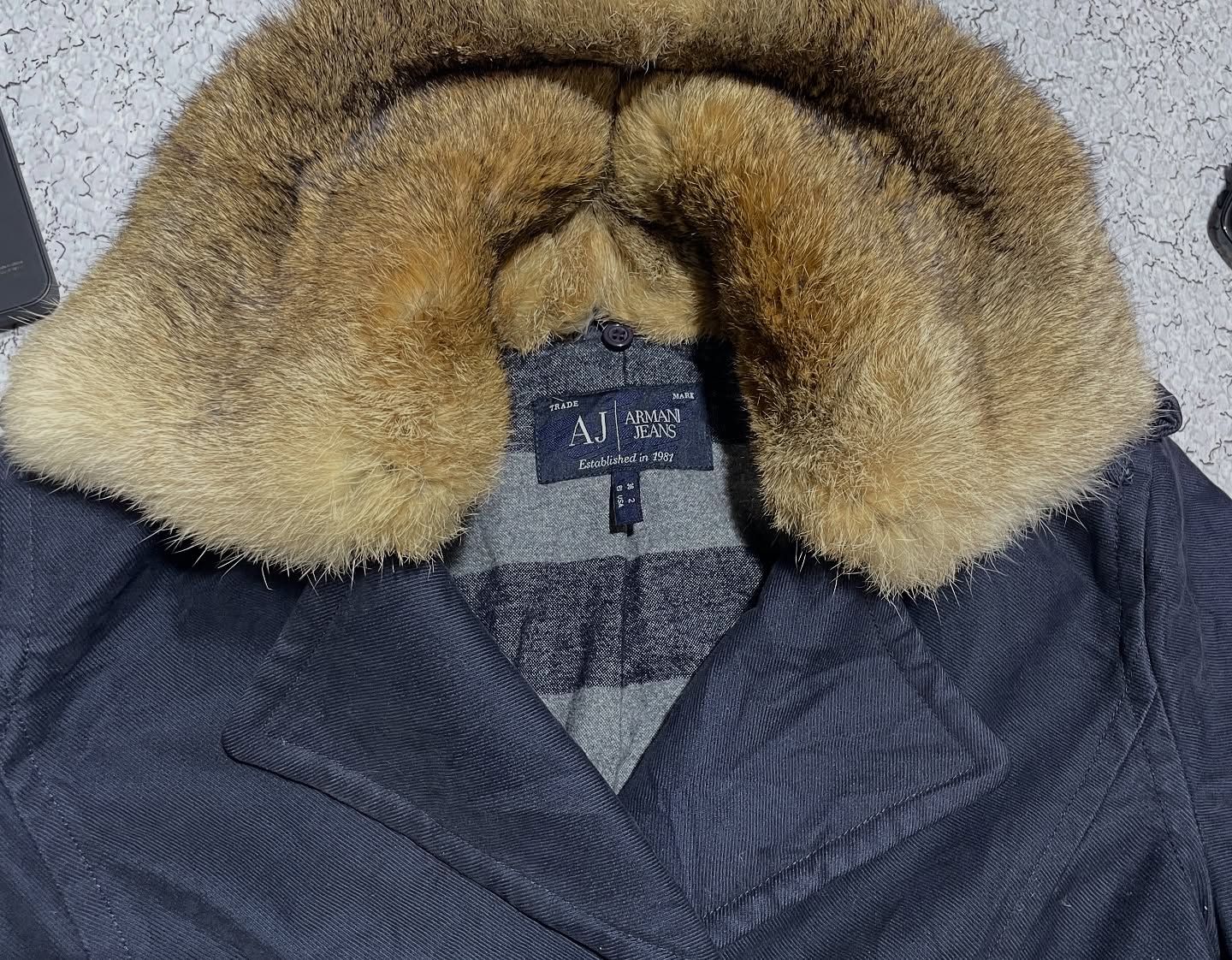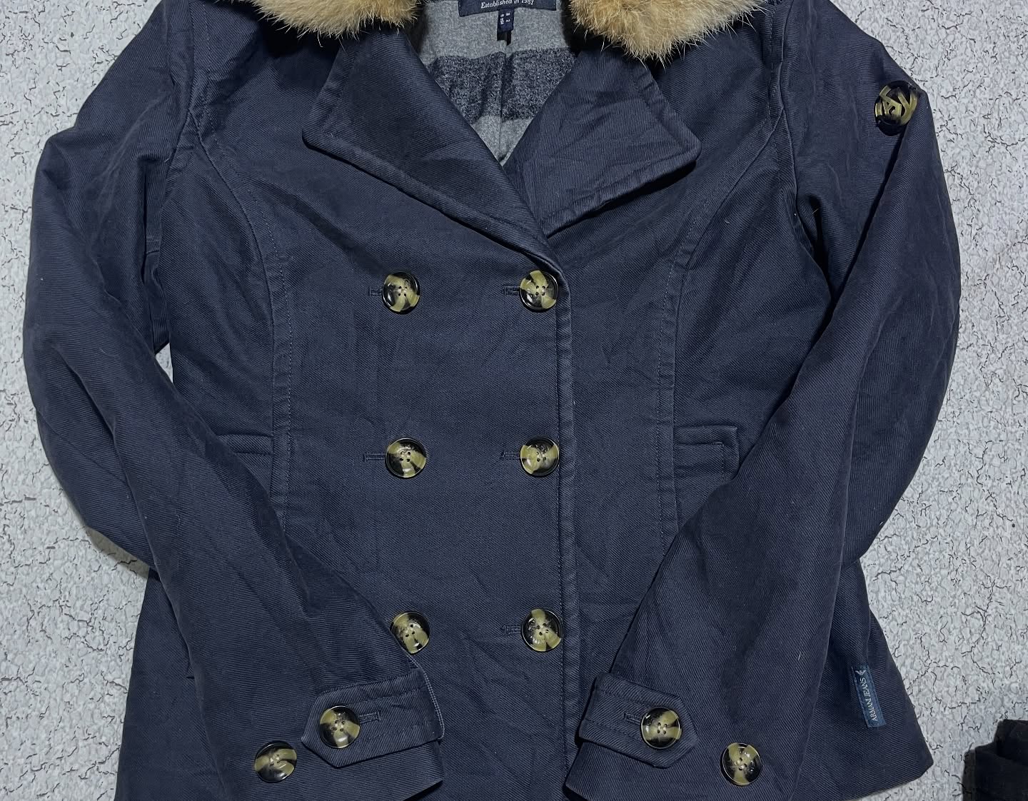 Premium Armani Jeans women’s winter coat in navy blue with a luxurious faux fur collar. Stylish double-breasted design with gold-tone buttons, warm inner lining, and a tailored fit for a classy winter look. Imported, pre-owned, and in excellent condition — perfect for fashionable winter wear.