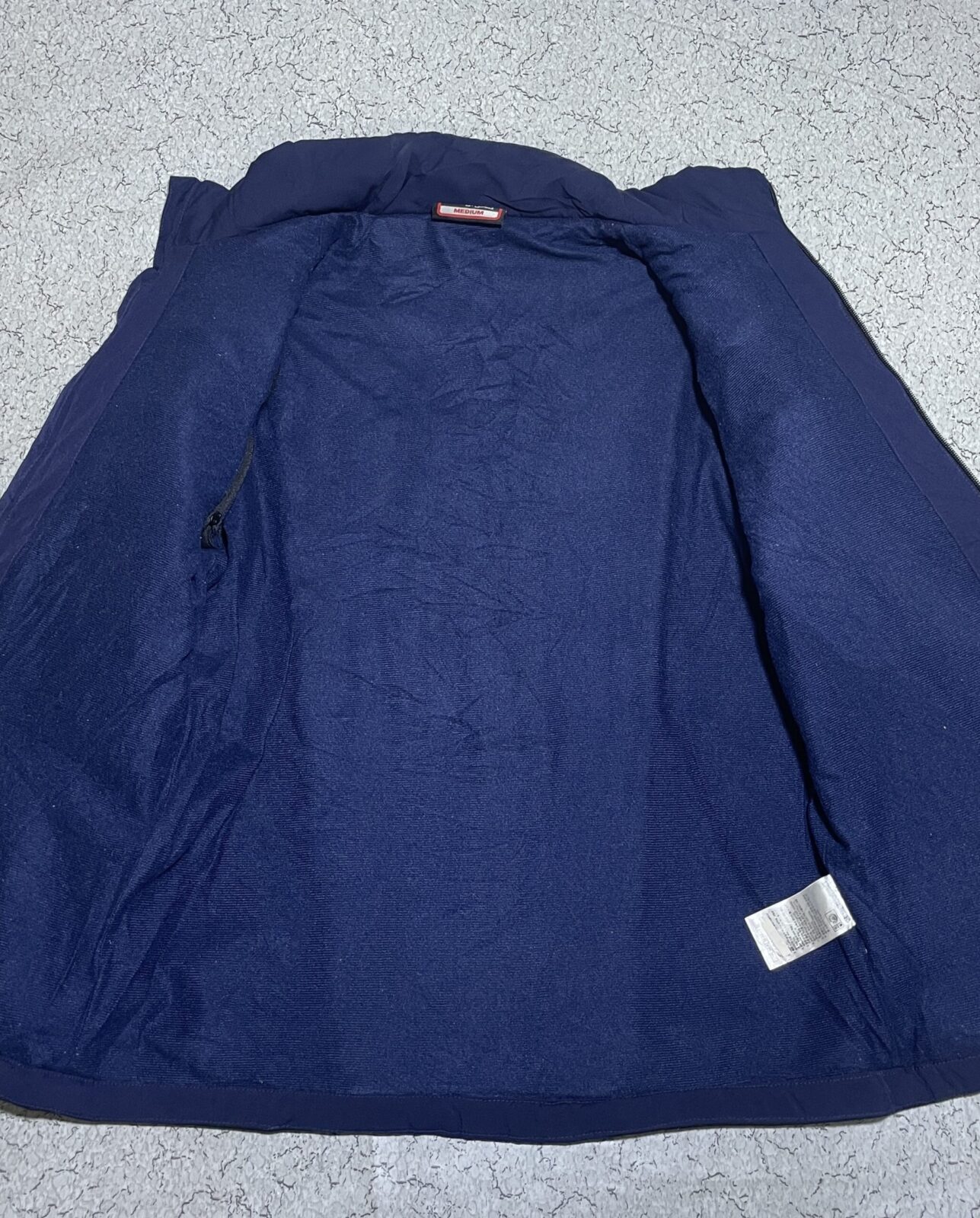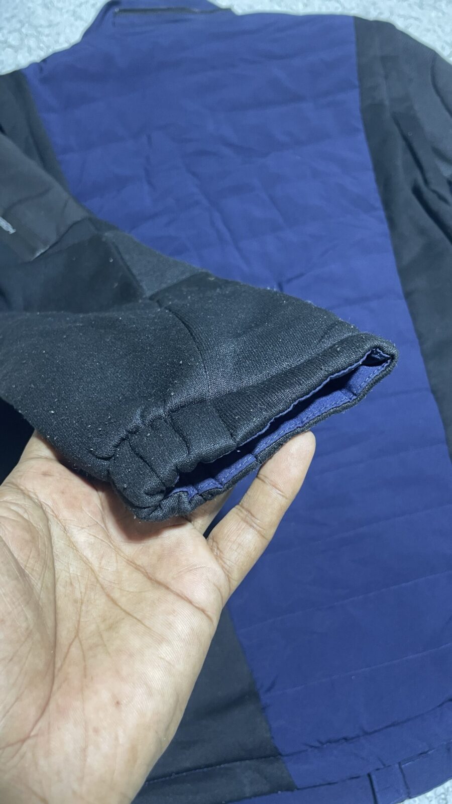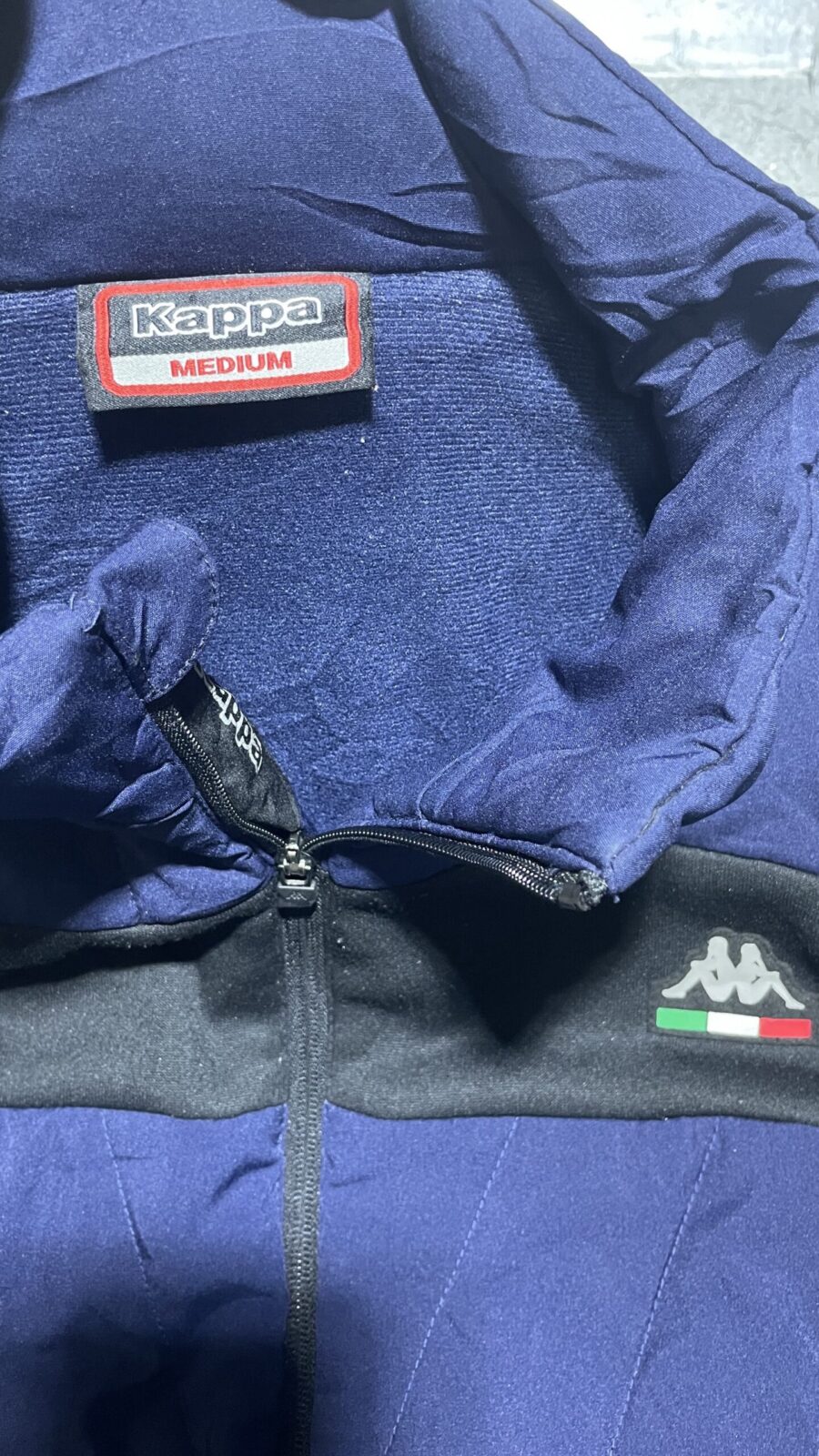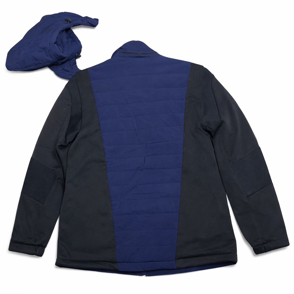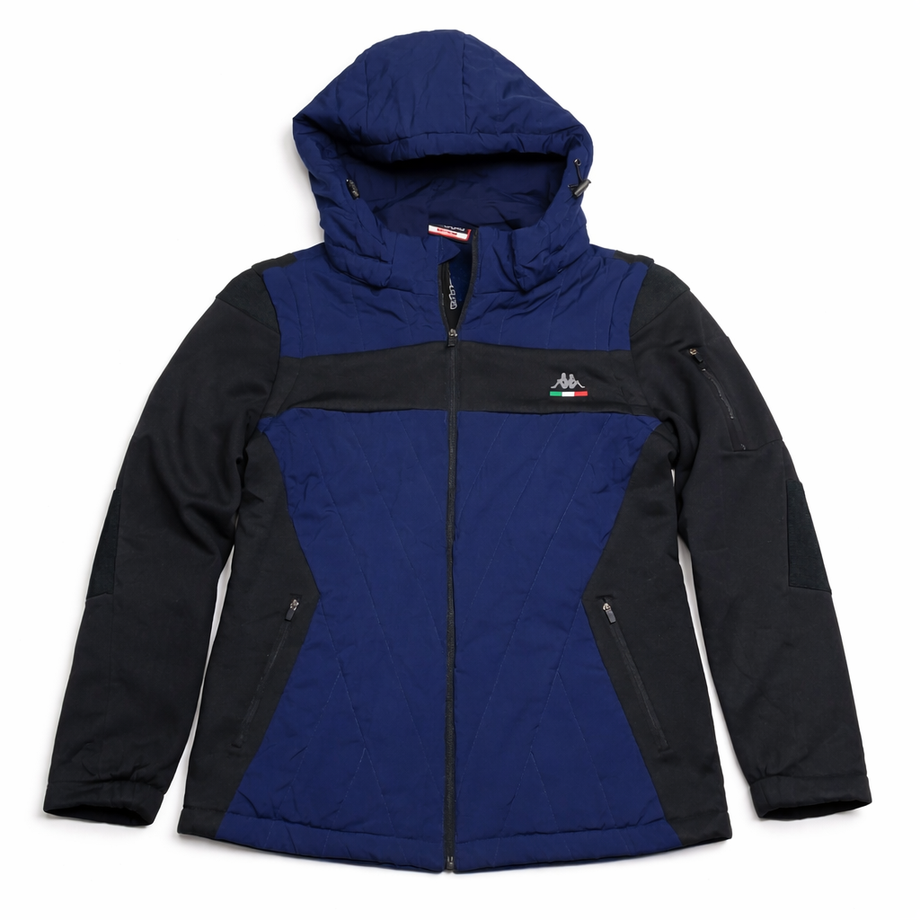Premium Kappa winter jacket in navy blue and black color block design. Features quilted padded front and back panel for warmth, softshell sleeves for comfort and flexibility, and a detachable hood for versatile styling. Comes with zippered hand pockets, arm zip pocket, full front zip closure, and Kappa logo detail on chest. Suitable for cold weather, casual wear, outdoor activities, and travel.