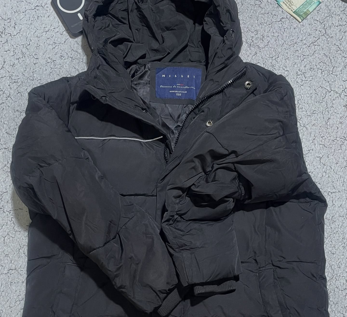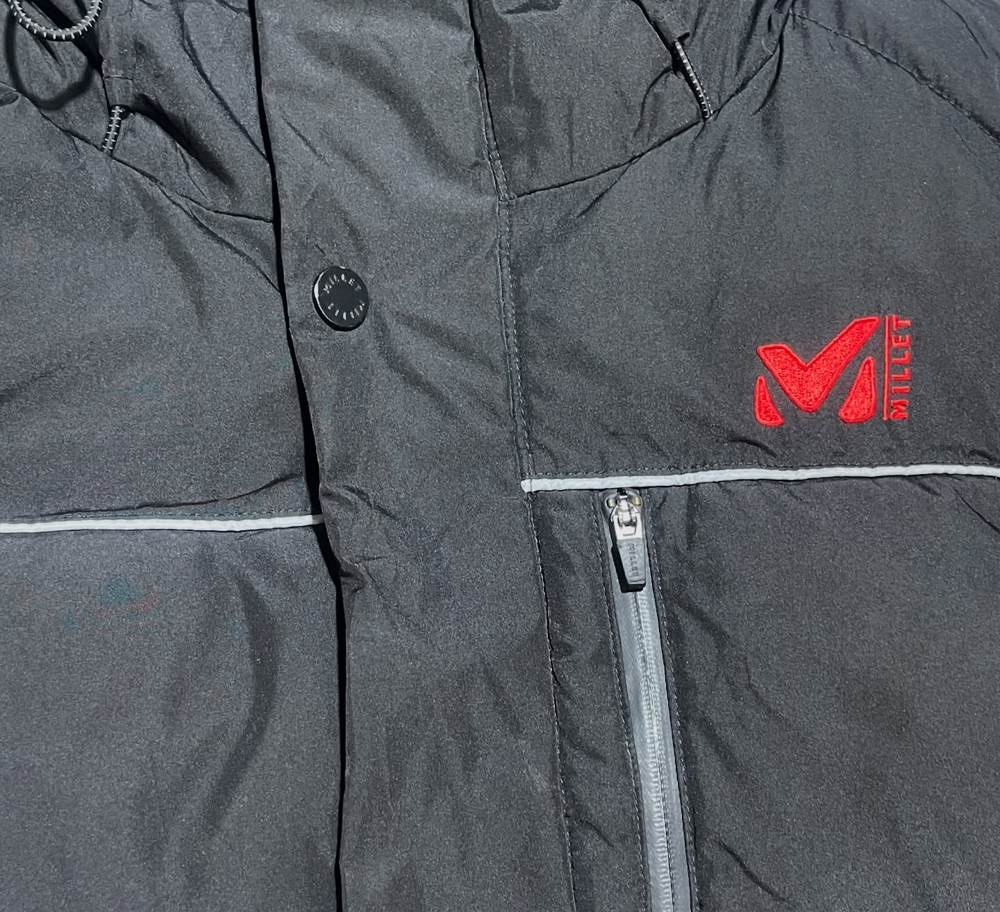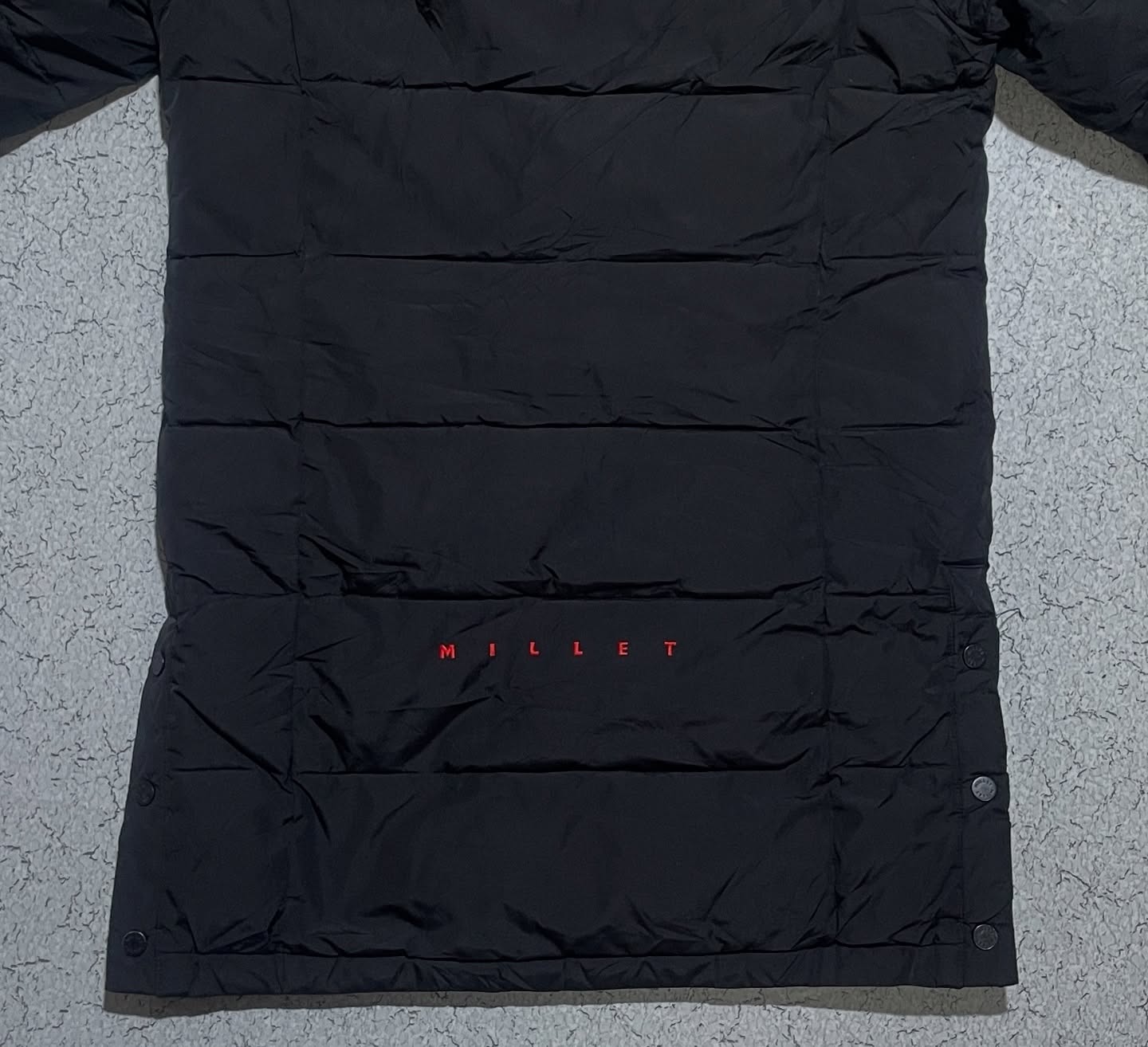 Premium Millet long winter parka in black, designed for extreme cold weather. Thick insulated padding, full-coverage length, adjustable hood, and secure zip + button closure. Features chest zip pocket, side pockets, and sleek reflective piping detail. Imported and pre-owned in excellent condition β perfect for strong winter protection, travel, and outdoor use.